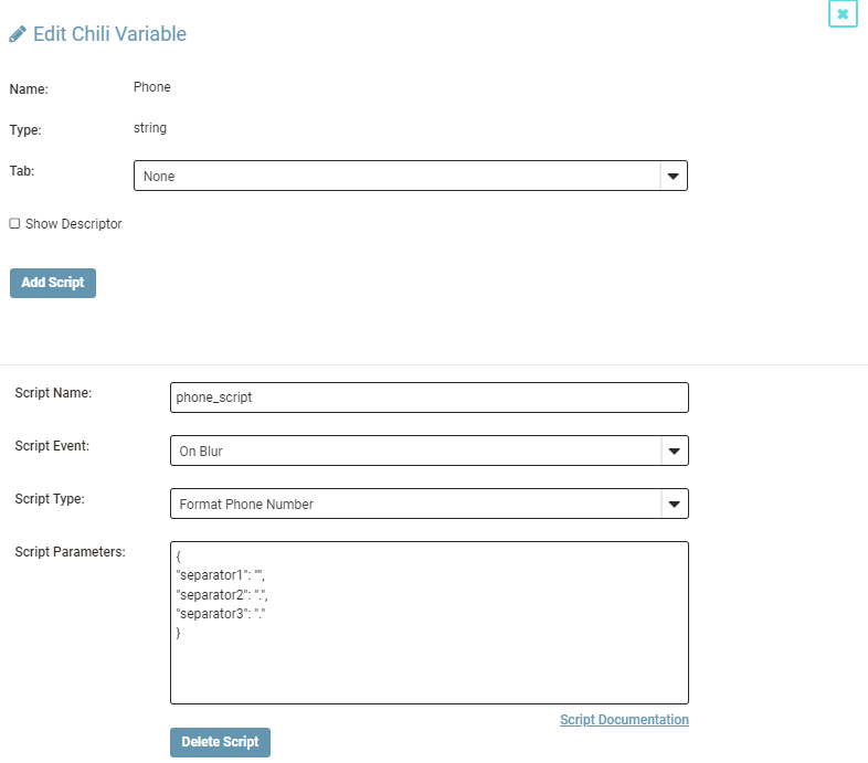 To add a Tab or a Script to a variable, you can either double click, or you can click the Edit icon that will appear upon hover. This action will bring up the following screen. In the example below, the variable includes a Script.