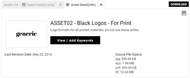 On both the Info and Comp views, you will also see the option to "View/Add Keywords." Any user can use this link to view the keywords for a particular asset and can add to the list. This enhances the search ability for that user and all other users. The admin can monitor/update the values at any time.