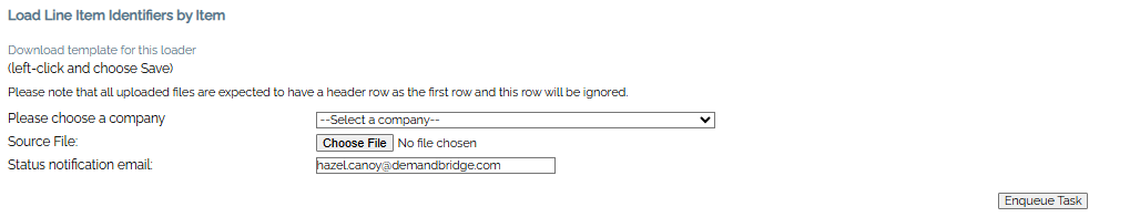 4. Browse for and upload your Source File. (The CSV file with the Item Code and Relates to Item Code.) 5. Enter an e-mail notification address. This address will receive an e-mail when the bulk load has been completed. 6. Press the Enqueue Task button. This will add your upload to the Task Manager. The system will upload these new item relations.