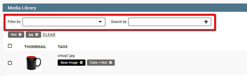 If a base promo item contains many files in its Media Library, administrators can filter the list of media items to only reflect those with a certain tag, or by searching using keywords and phrases such as part of a file name, video URL, or file extension. Filters may be used in conjunction with one another for a more refined search.