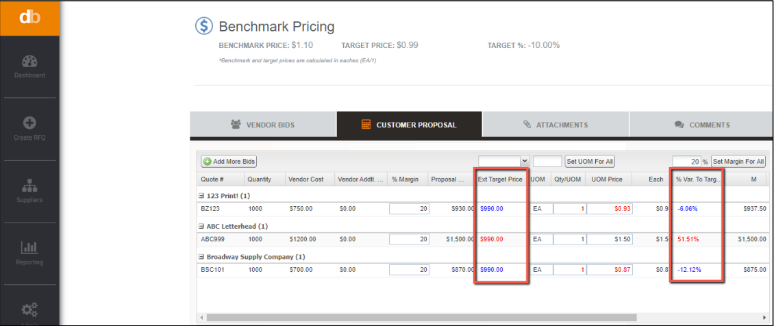 Prepare/Send Proposal – When viewing and applying margin to vendor bids, additional columns containing metrics such as extended Target Price (“Ext Target Price”) and percentage variance to Target Price (“% Var. To Target Each”) are shown to help users make sure they’re proposing pricing that will meet their customers’ needs. Blue highlighting within these columns indicates that prices are below the desired threshold while red means they’re too high. Additional columns containing other useful data (e.g. $ Variance to Benchmark Price) are hidden by default but may be shown by hovering over the column headers, expanding the “Columns” menu, and checking the boxes to enable columns of interest.
