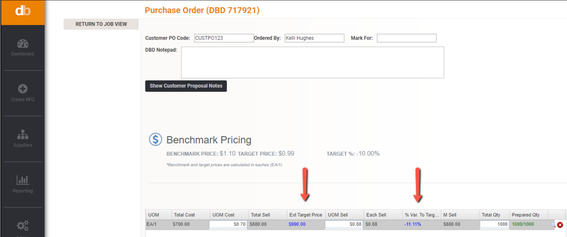 When preparing a Purchase Order, DB Sourcing displays the same Benchmark and Target Price UI elements that appear during proposal creation. This ensures that any last-minute adjustments to cost or sell price are made with full visibility into the customer's Benchmark and Target Price expectations.