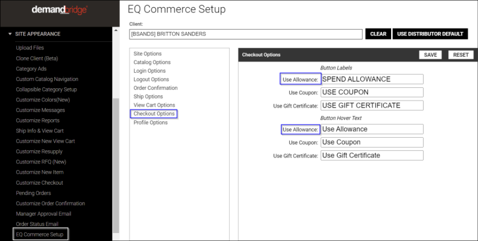 Allowance labels can be changed in EQ Commerce Setup. Select the client from the dropdown then click on Checkout Options. Enter the desired wording in the button labels and Save!