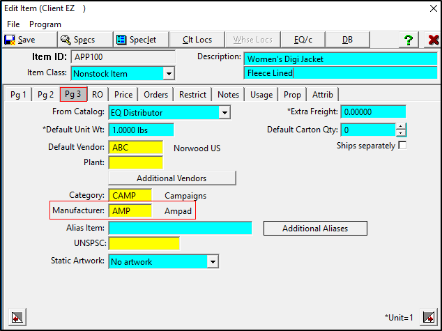 Assign the Manufacturer’s Code to the item via Item Maintenance.