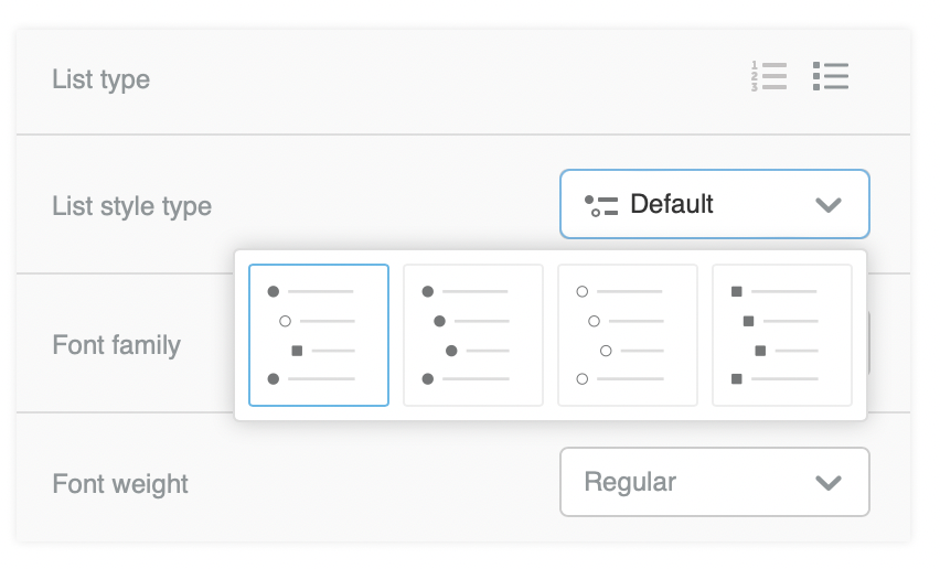 - List - This content block includes all the new features seen in the paragraph content block. However, you'll find some content properties specific to list content. The options specific to the list content block are as follows: