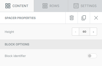Spacer - The spacer content block acts much like a transparent divider in that it simply creates blank space in your design. As a result, the only setting that the spacer has in the sidebar is Height, which allows you more granular control over the empty space you are creating.